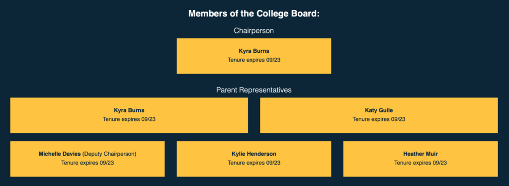 The Board is comprised of the Principal, two elected members of staff, five elected parents of current students and three community members.